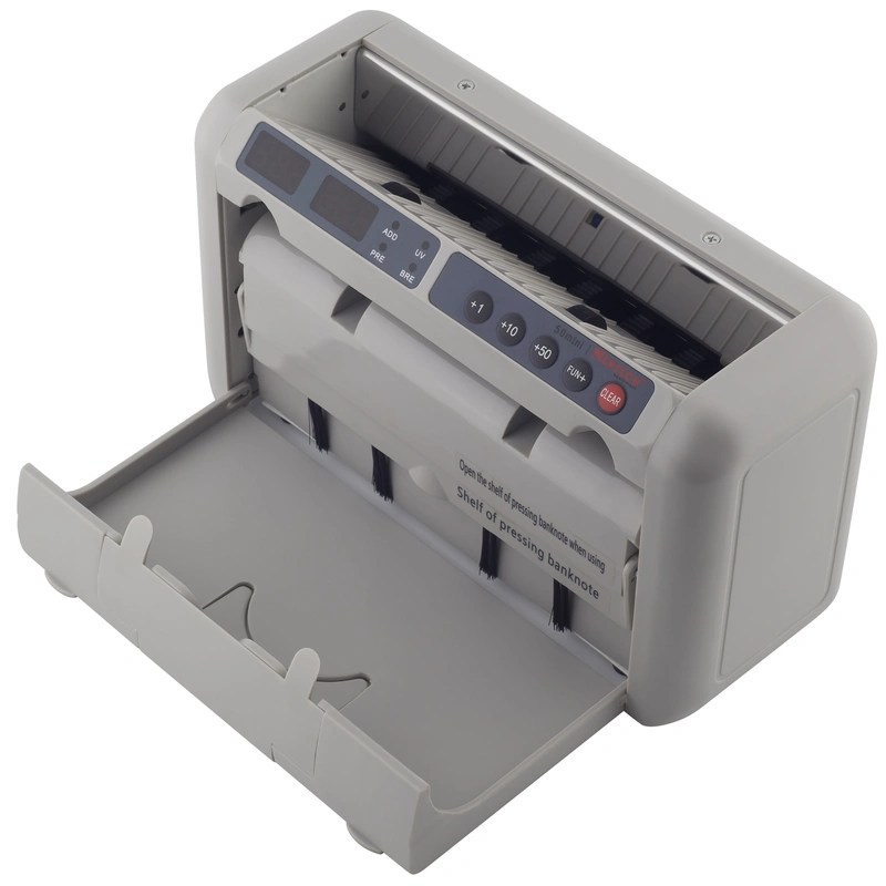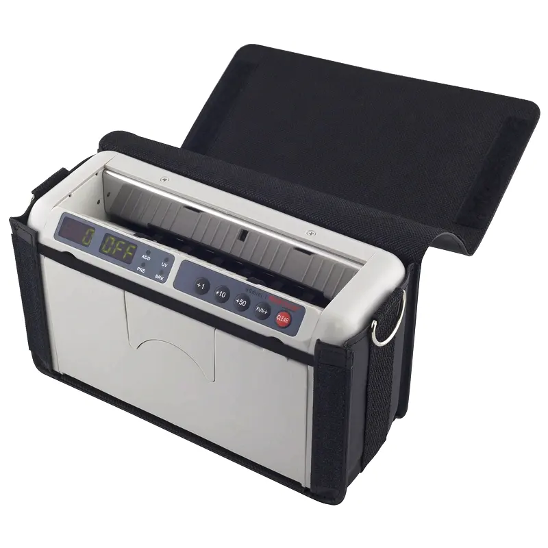Компактный и быстрый портативный счетчик банкнот для точного пересчета наличных. Идеально подходит для офисов, магазинов и выездной работы.